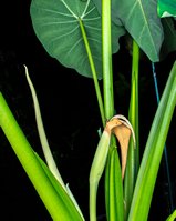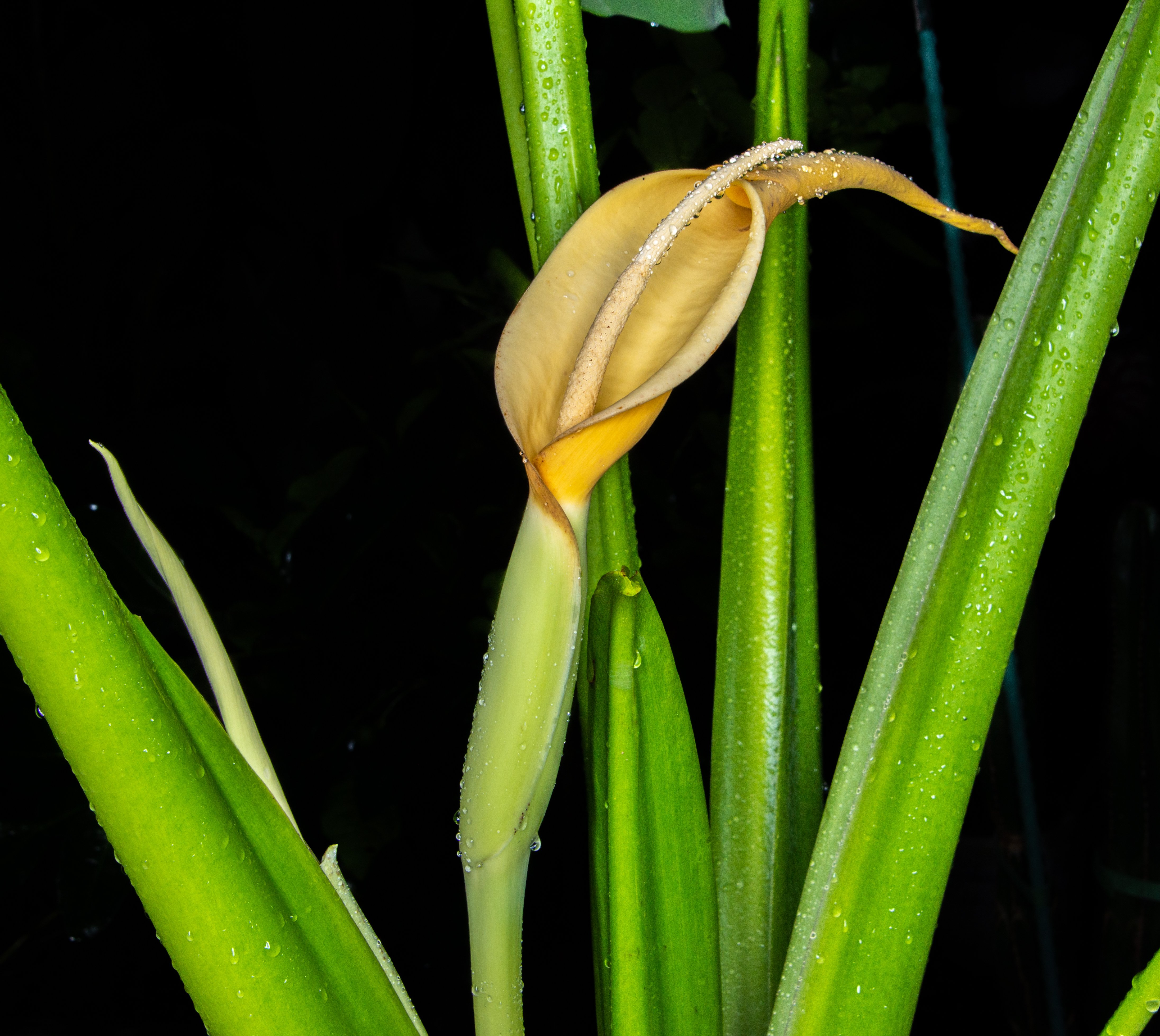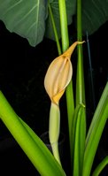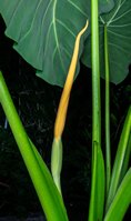 Here is a Colocasia gigantea grown from the one and only tuber I managed to get out of the ground and save despite a work marathon at the end of summer, 2019. The plant is growing in a 24-inch pot on my driveway, a driveway which gets bright sun most of the day. Besides the warm daily temperatures, the plant receives reflected heat from the asphault. I've kept the soil soaking wet and have fertilized at least once a week with liquid fertilizer (20-10-20) via a Dosatron. I was picking up lawn debris that that had moved to the driveway when I noticed the bloom. Notice how quickly it progresses. There were no other blooms at the time and so no chance for pollination.